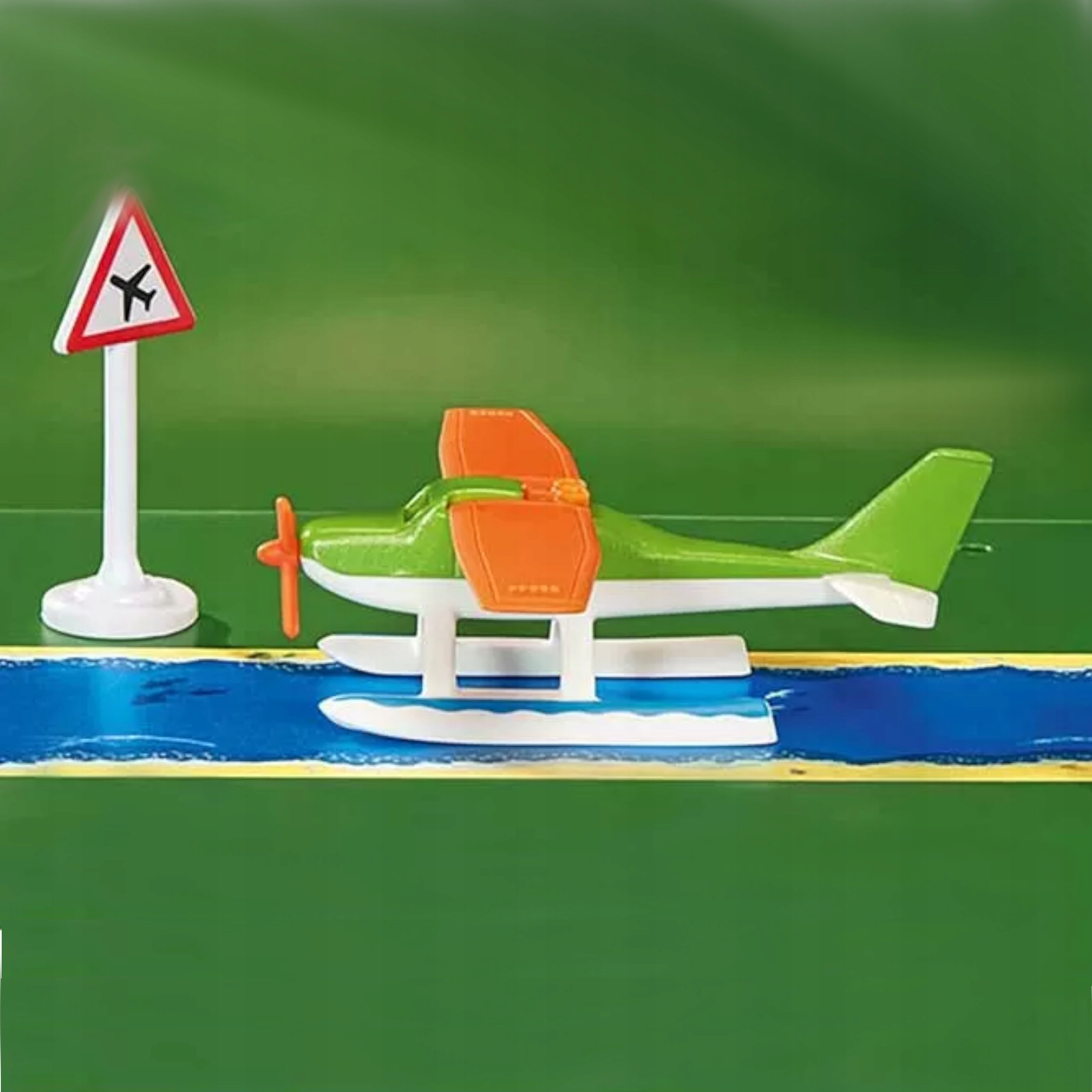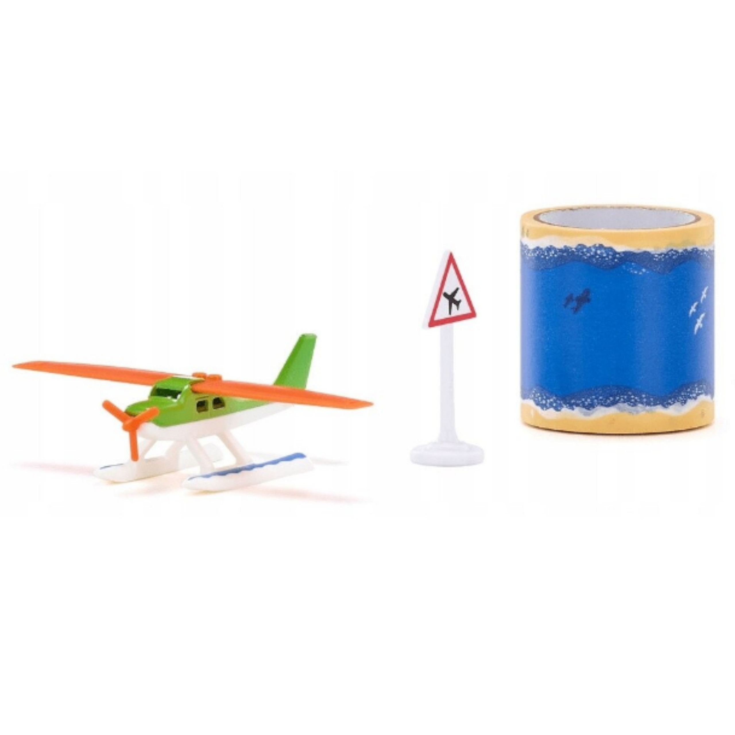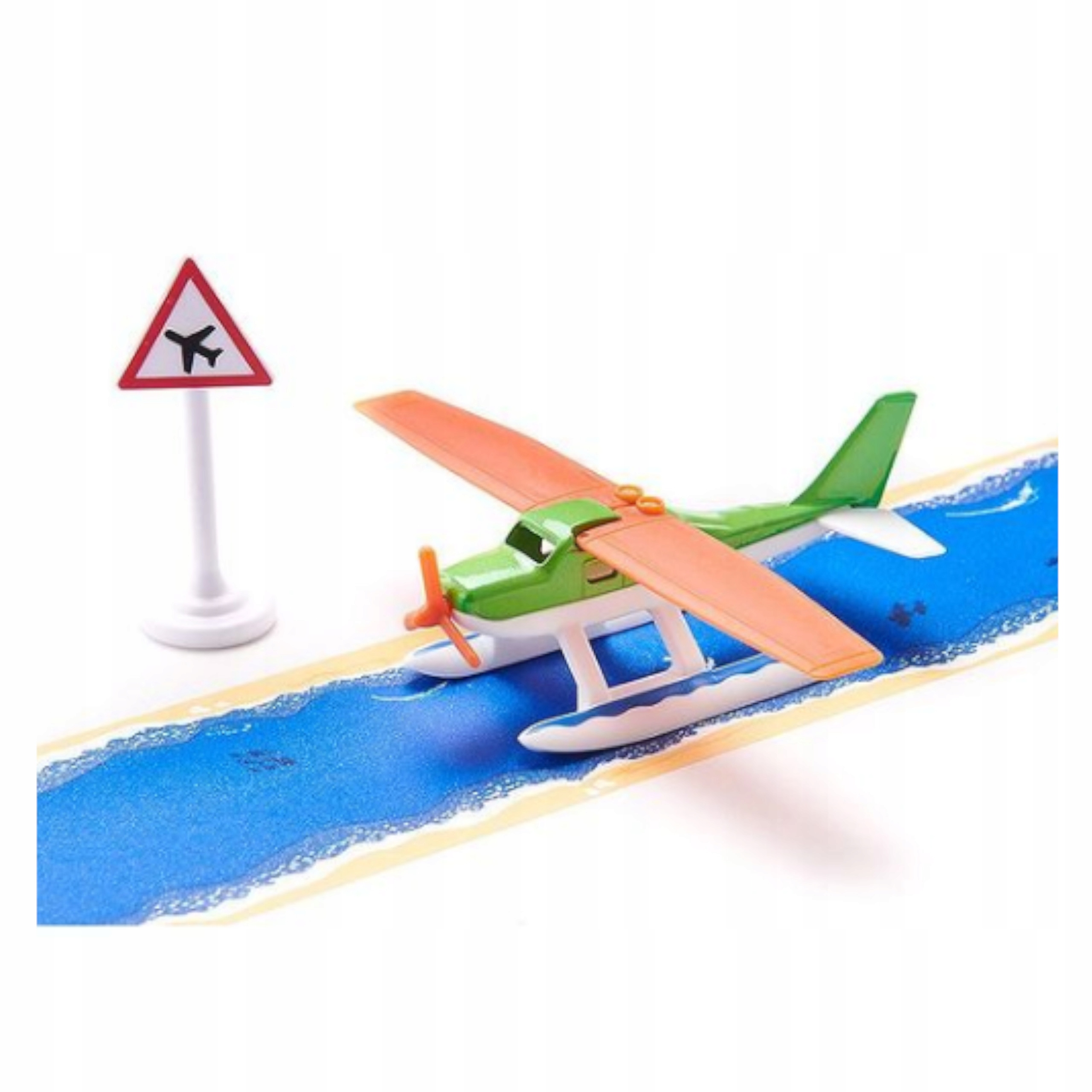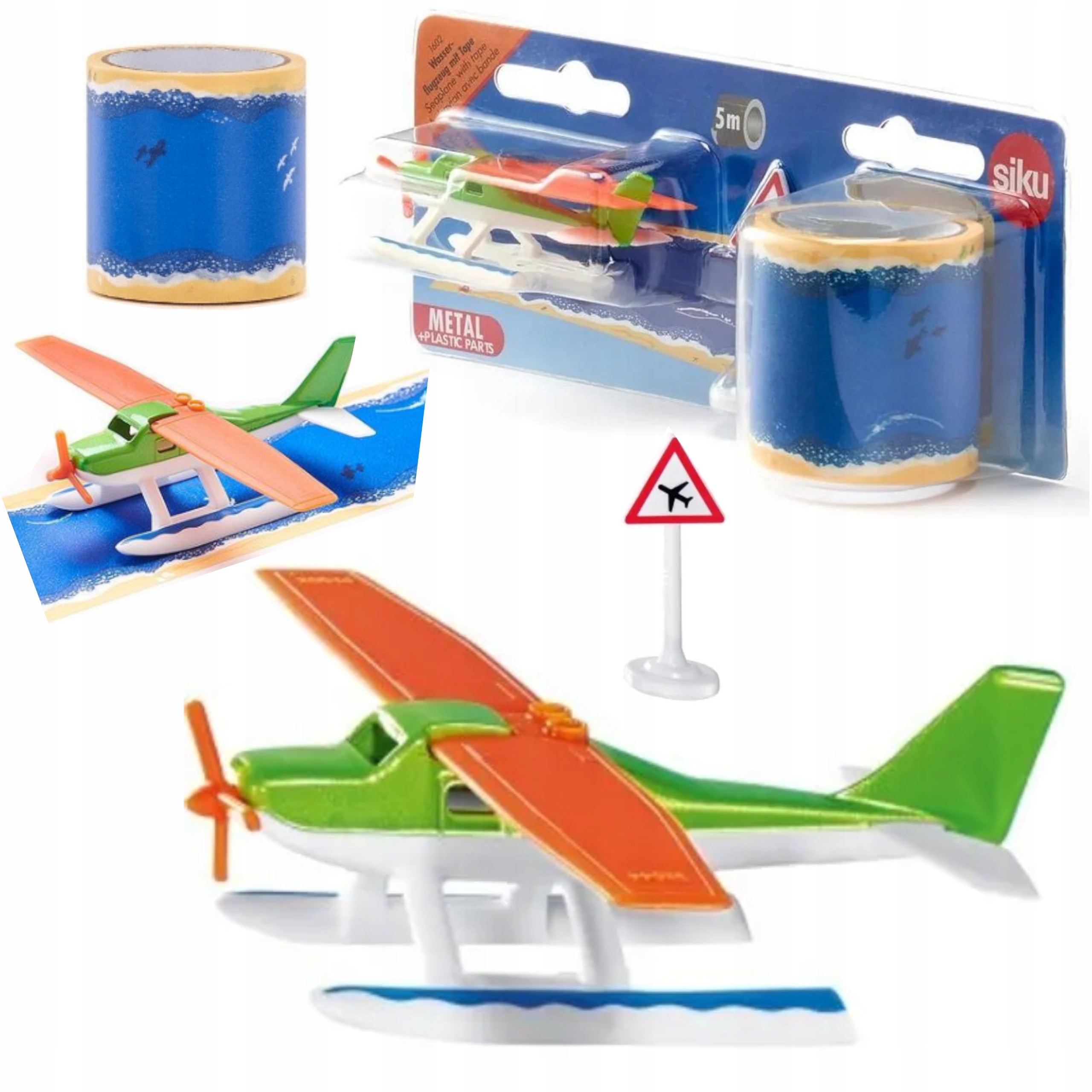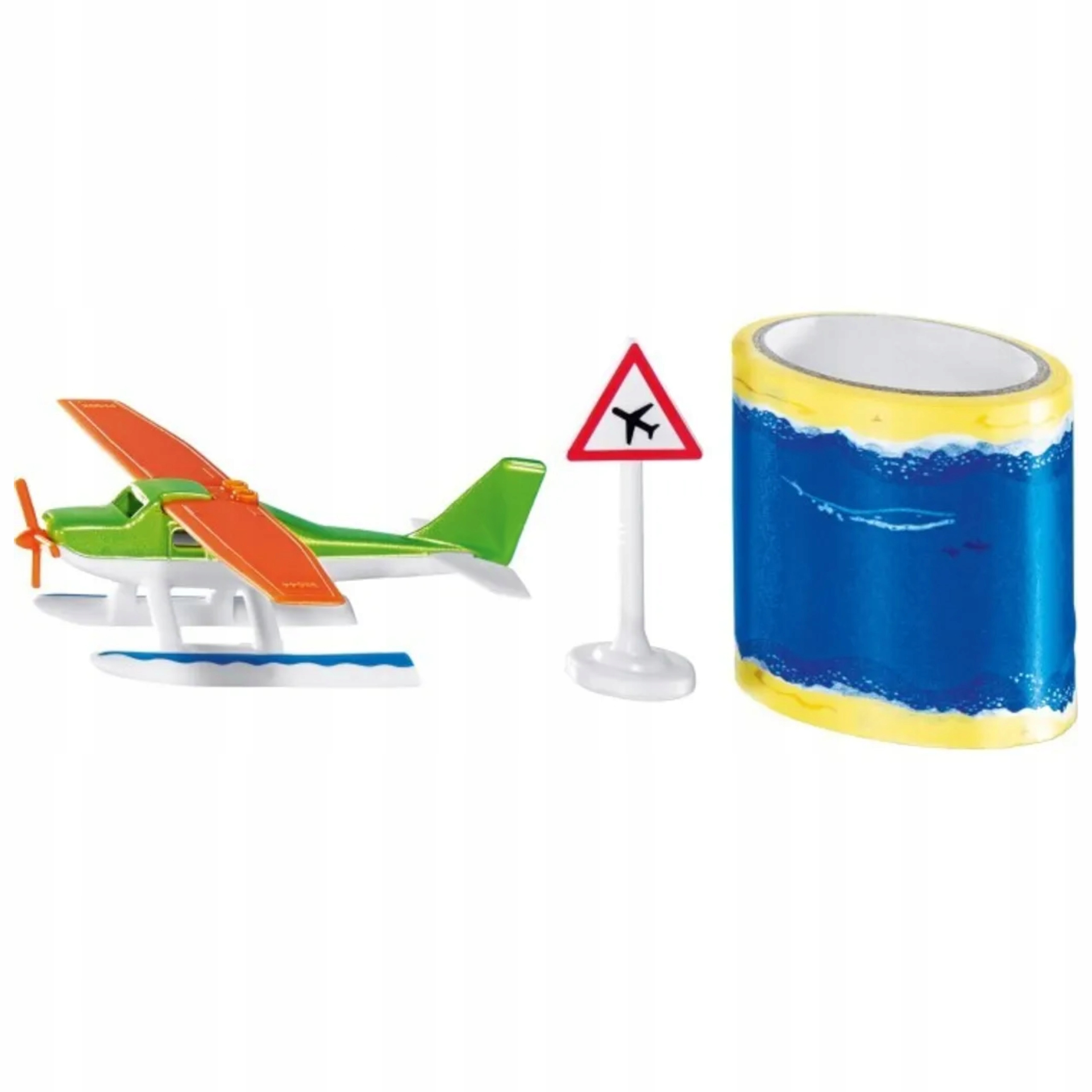 W zestawie znajduje się znak drogowy i taśma z nadrukowaną wodą. Taśmę można nakleić na gładkiej powierzchni i tworzyć trasy do lądowania i startu wodnosamolotu.