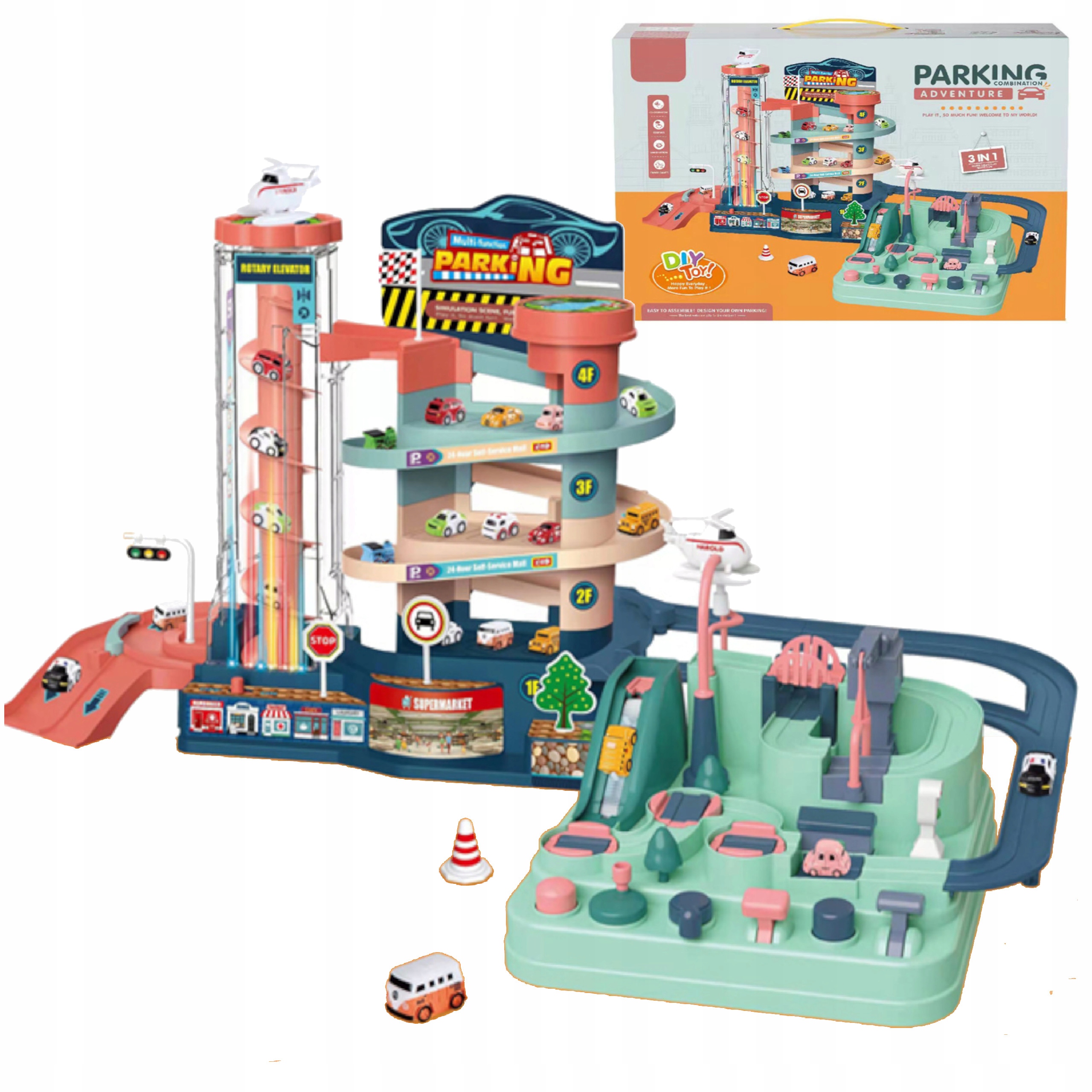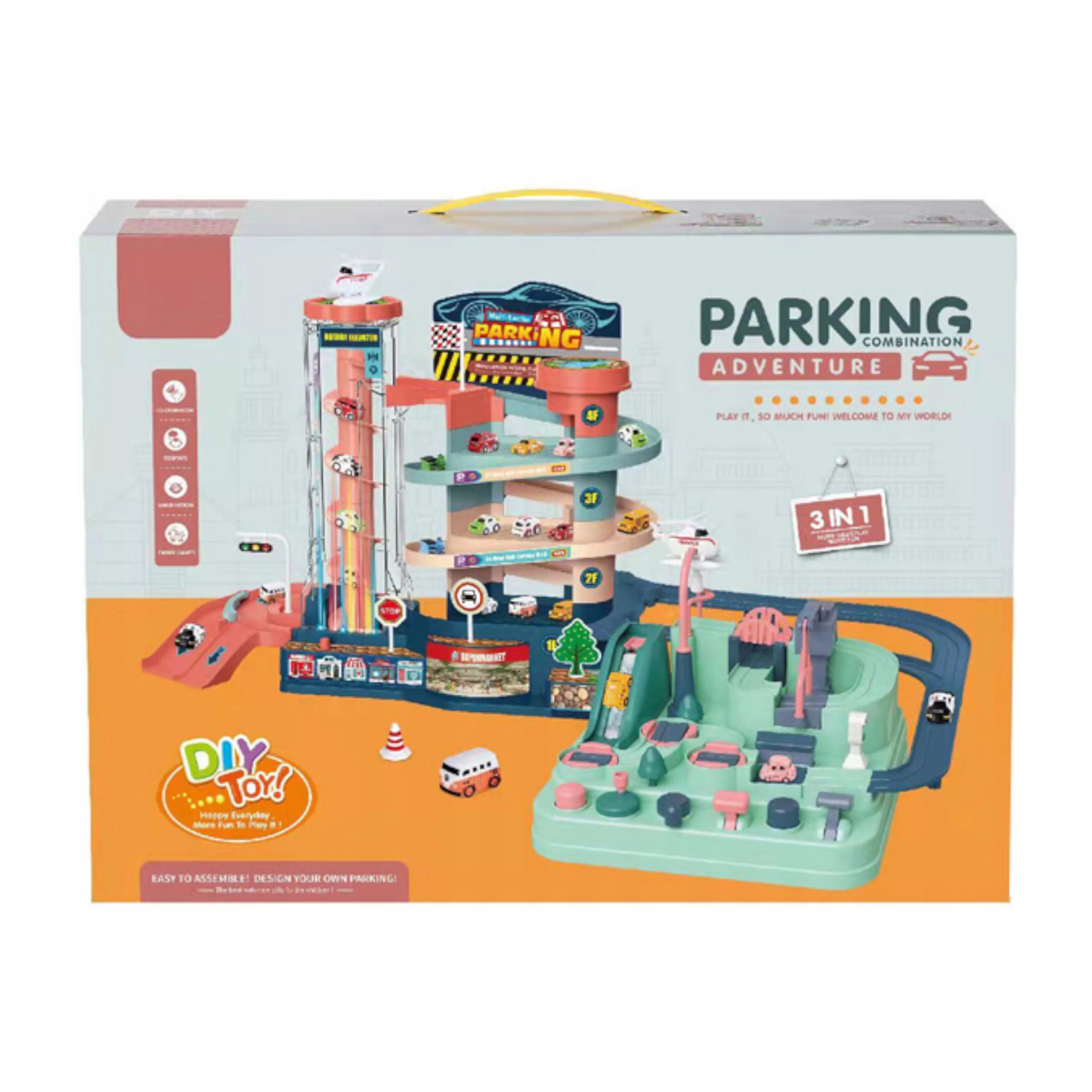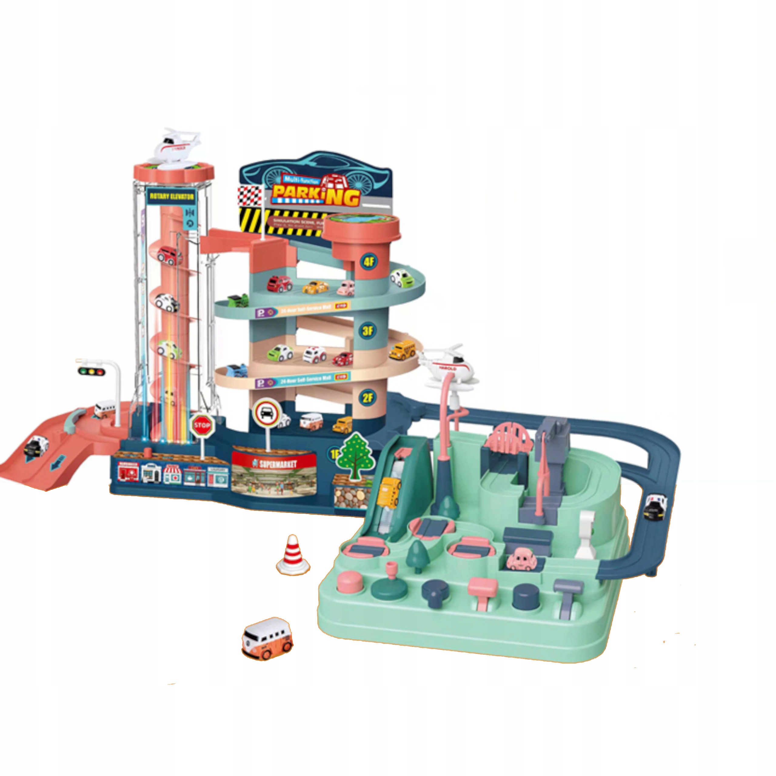 Po pokonaniu toru samochody udają się na drugą część – manualny tor przeszkód. Dziecko musi zastanowić się w jaki sposób samochody powinny go pokonać, a następnie zrealizować plan, by umieścić samochód ponownie na głównej części toru, gdzie ponownie zjedzie na sam dół w kierunku toru przeszkód – i tak w kółko. Dzięki temu Twoje dziecko w łatwy sposób rozwinie swoje logiczne myślenie.