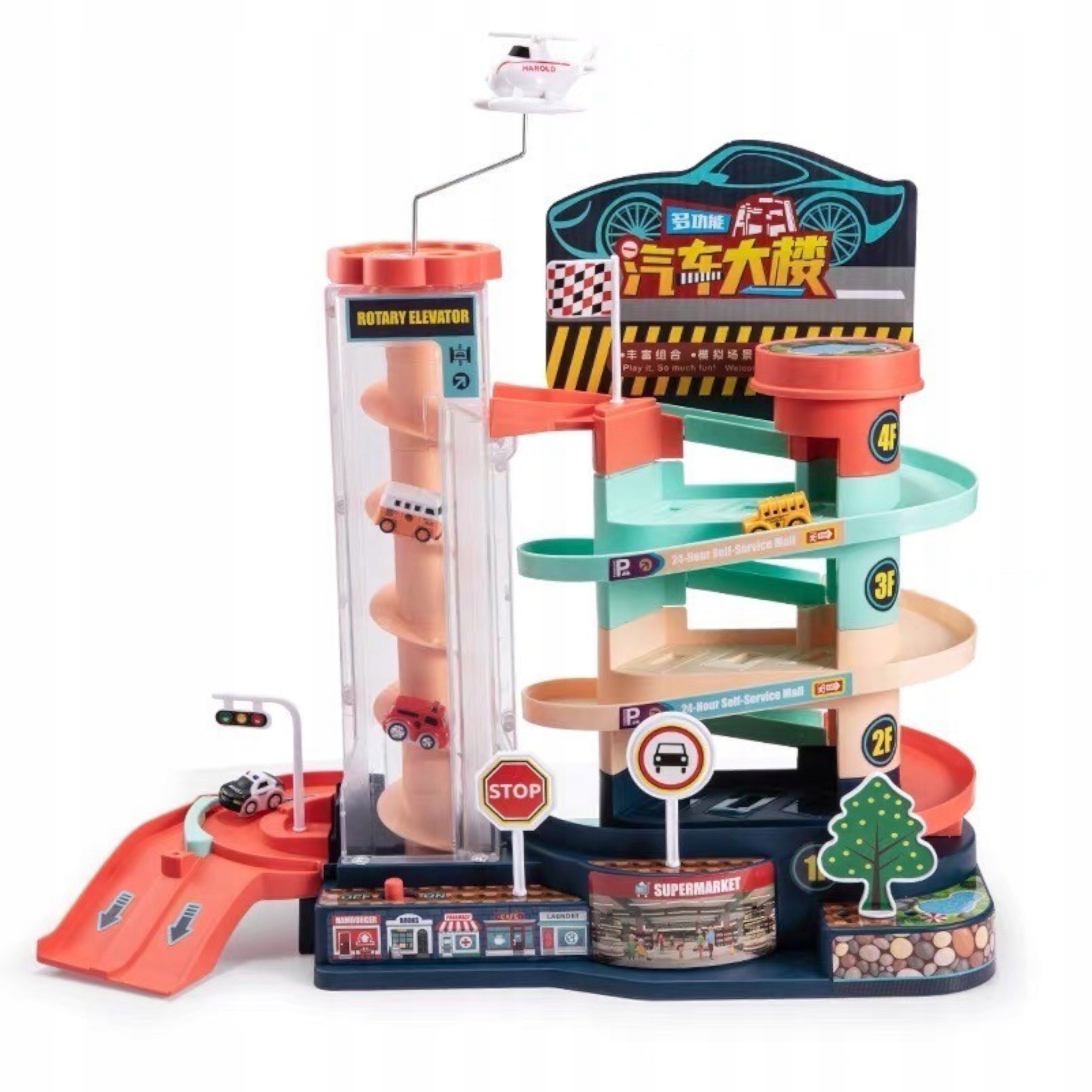 - 7 różnych autek z magnesami, dzięki którym mogą się przyciągać do helikoptera na torze przeszkód