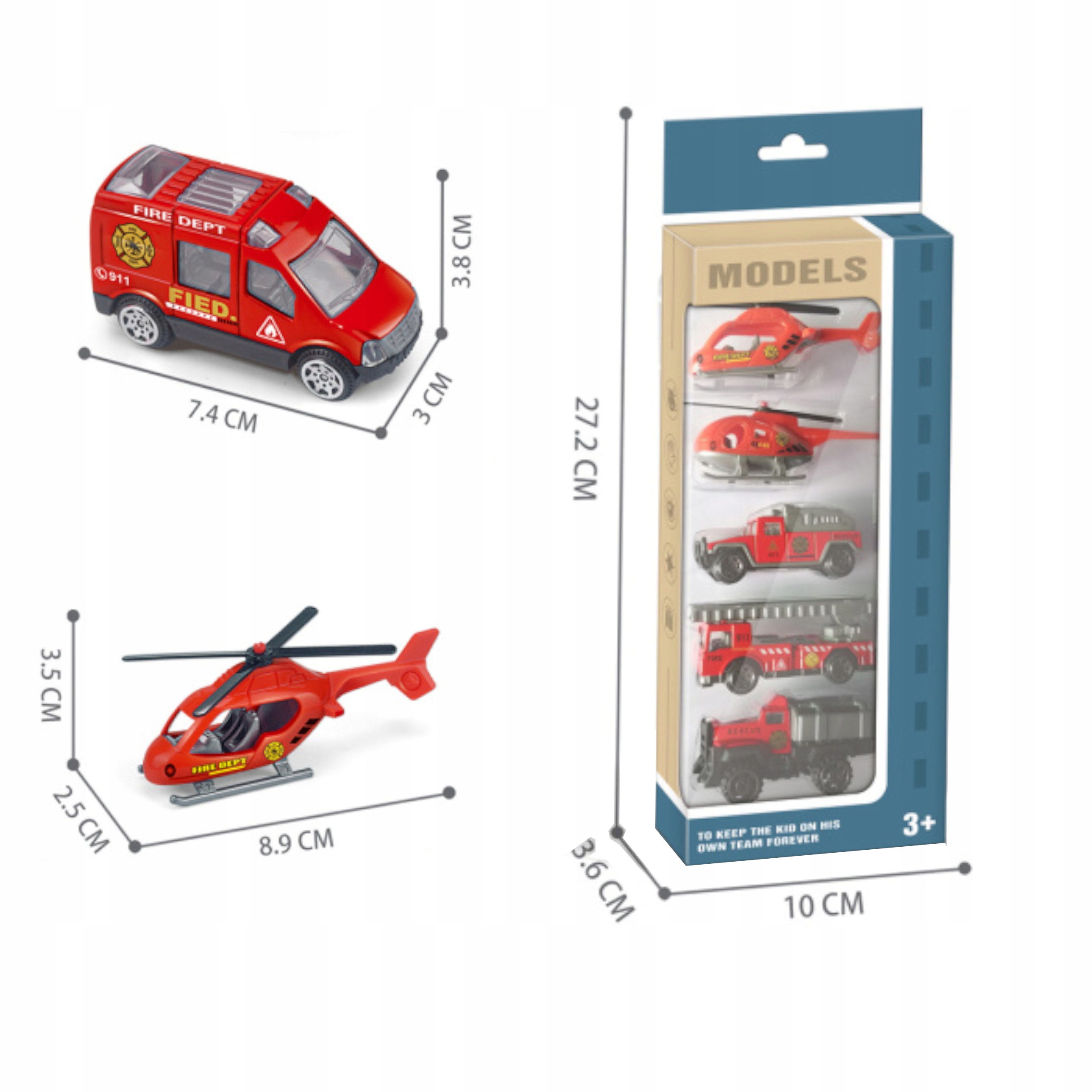Zestaw zawiera aż 5 różnych pojazdów po 2 helikoptery i 3 wozy w ładnych odcieniach koloru czerwonego z wzorem straży pożarnej. To idealny prezent dla każdego dziecka, które chce pobawić się w strażaka czy przeprowadzić strażacką akcję Każdy pojazd jest inny. Zabawki zapewnią świetną zabawę na długi czas.