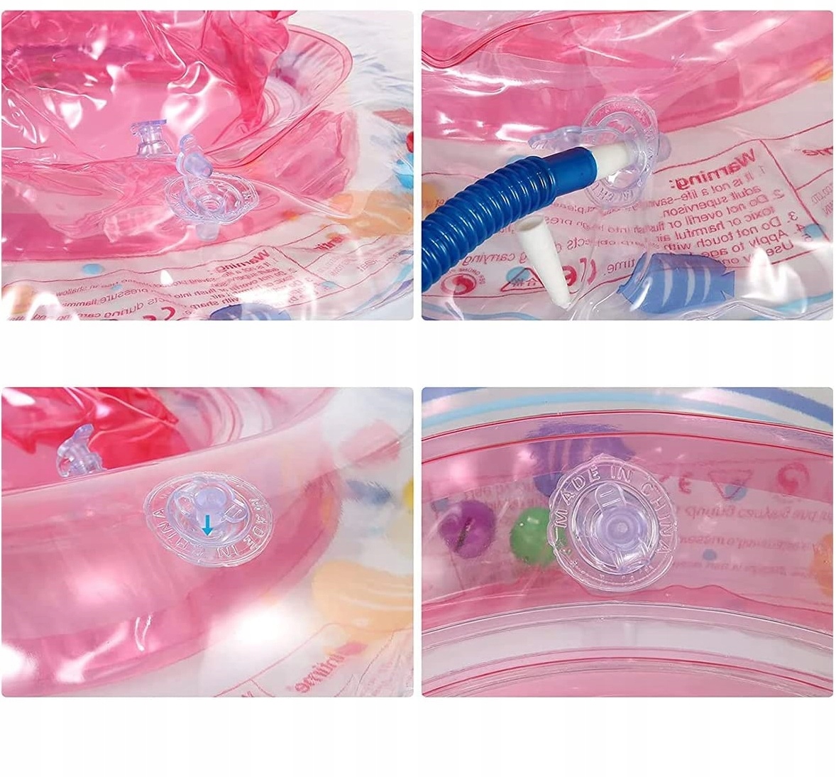 Pływające siedzisko składa się z dużego okrągłego pływaka w kształcie kwiatka, który zapewnia równowagę oraz siedzonka w stylu majteczek z otworami na nóżki. Całość składa się z dwóch osobnych komór.