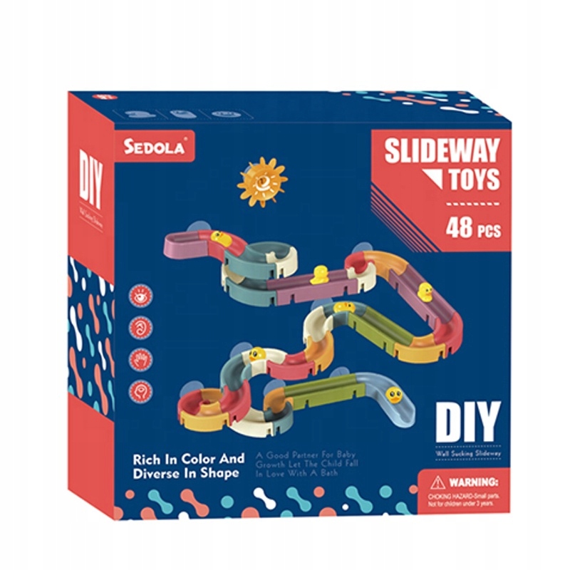 Kreatywna zabawka do kąpieli w postaci zjeżdżalni z kaczuszkami to idealna zabawka, aby umilić kąpiel Twojemu dziecku. Zestaw wykonany jest z porządnego, grubego plastiku oraz dużych, silikonowych przyssawek, dzięki którym bez problemu można przyczepić zabawkę do szyby kabiny prysznicowej, wanny albo do kafelek. Polecamy również patent, który sami stosujemy – zabawkę można przytwierdzić do wanienki dla dziecka.