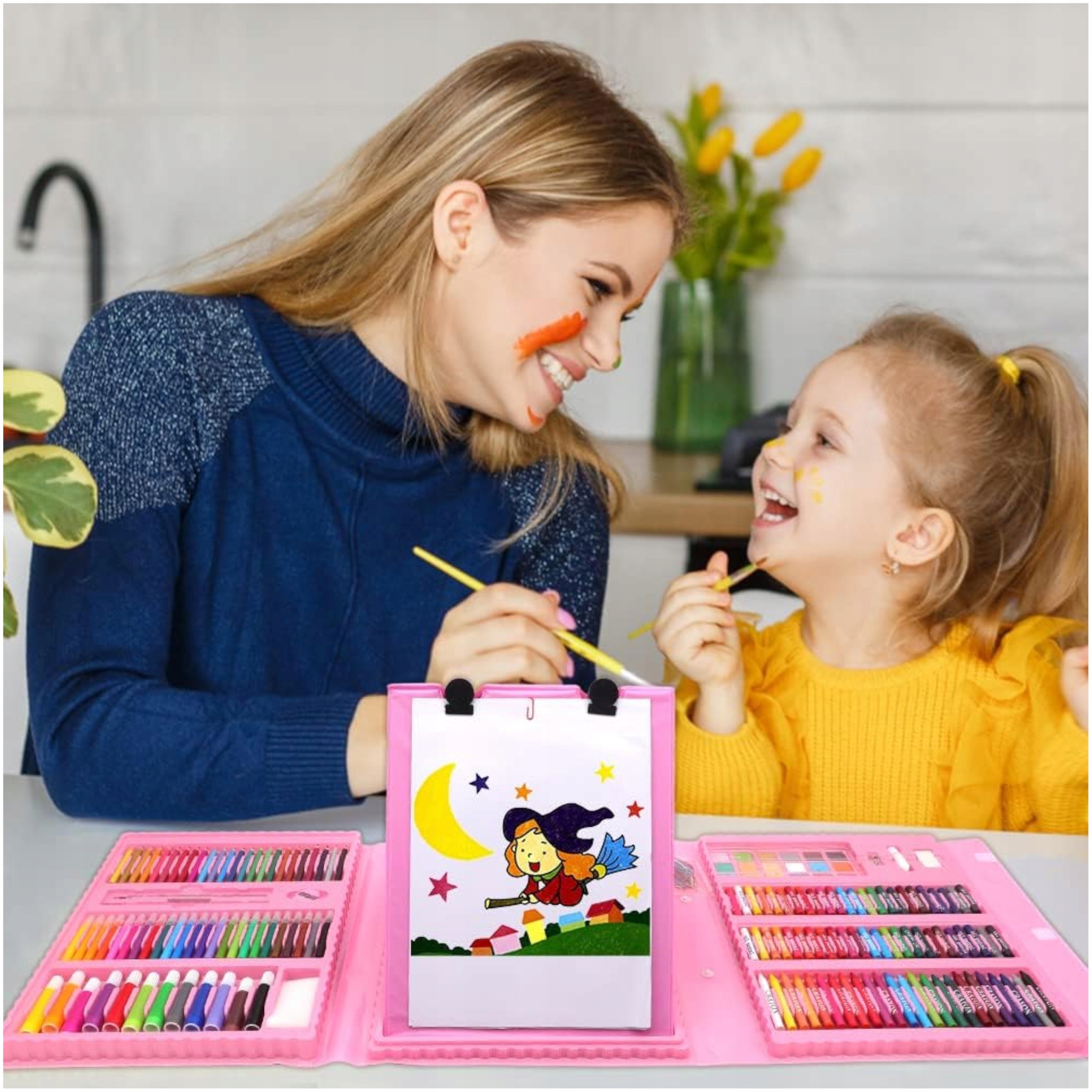 Zestaw 203 elementów jest zapakowany w poręczną walizkę z rączką zapinaną rzepy. Pozwala to zabrać ulubione przybory do rysowania w każde miejsce w domu, do ogrodu, do szkoły, na wyjazd czy na spotkanie z przyjaciółmi. W walizce każdy element ma przypisane swoje miejsce, co ułatwia znalezienie konkretnej kredki czy farby. To rozwiązanie pozwala także na utrzymanie porządku i pomaga w sprzątaniu po skończonej zabawie – wystarczy odłożyć każdą rzecz do jej zagłębienia.