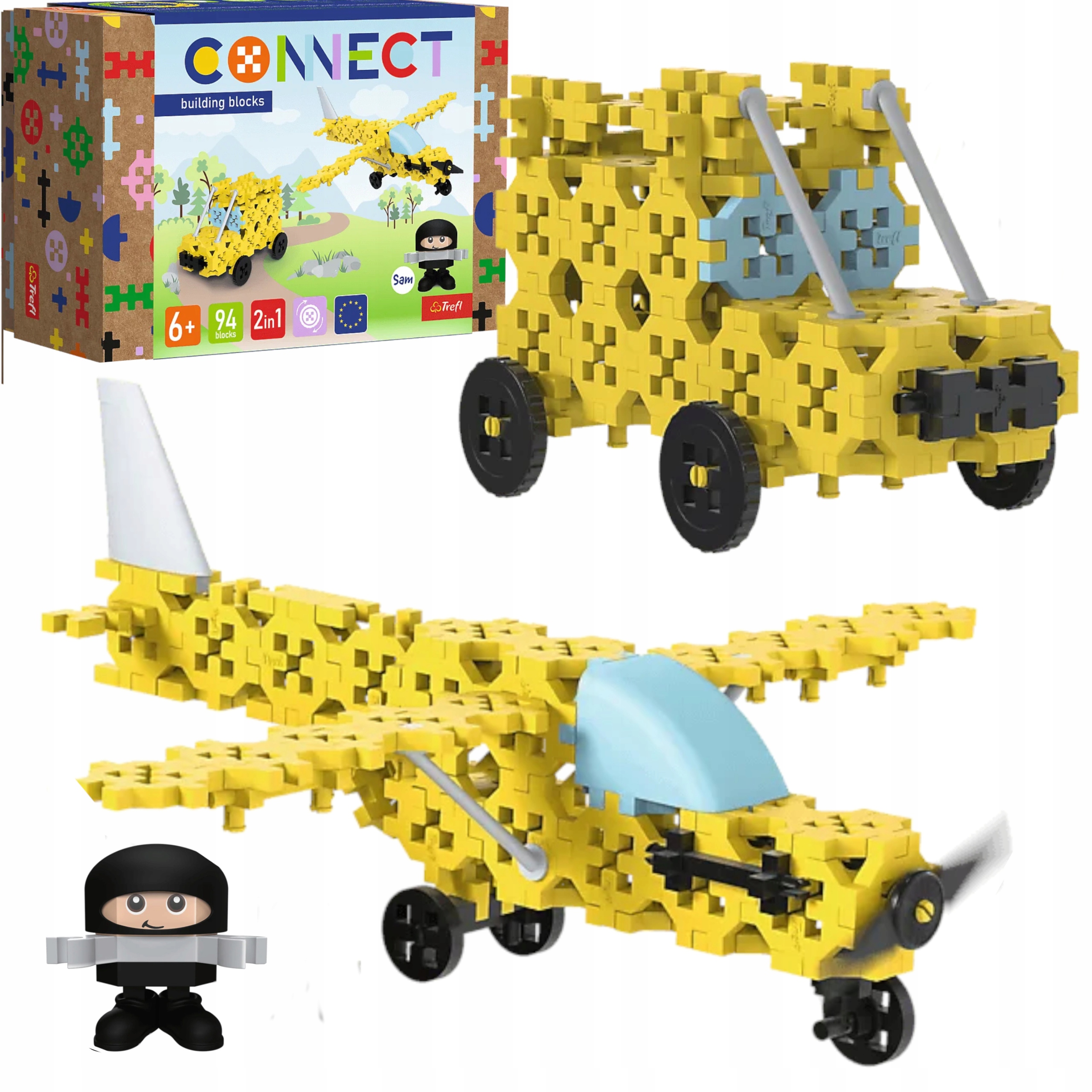 Zestaw klocków Connect 2w1 zawiera aż 94 klocków, z których można ułożyć dwa pojazdy: awionetkę lub jeepa albo można tworzyć własne konstrukcje. W zestawie są tez klocki dekoracyjne: okna, drzwi, maskę czy zderzaki, które uatrakcyjnią zbudowane samochodziki. Figurka kierowcy o imieniu Sam, pozwala na tworzenie własnych historii, pobudzając wyobraźnię dziecka.