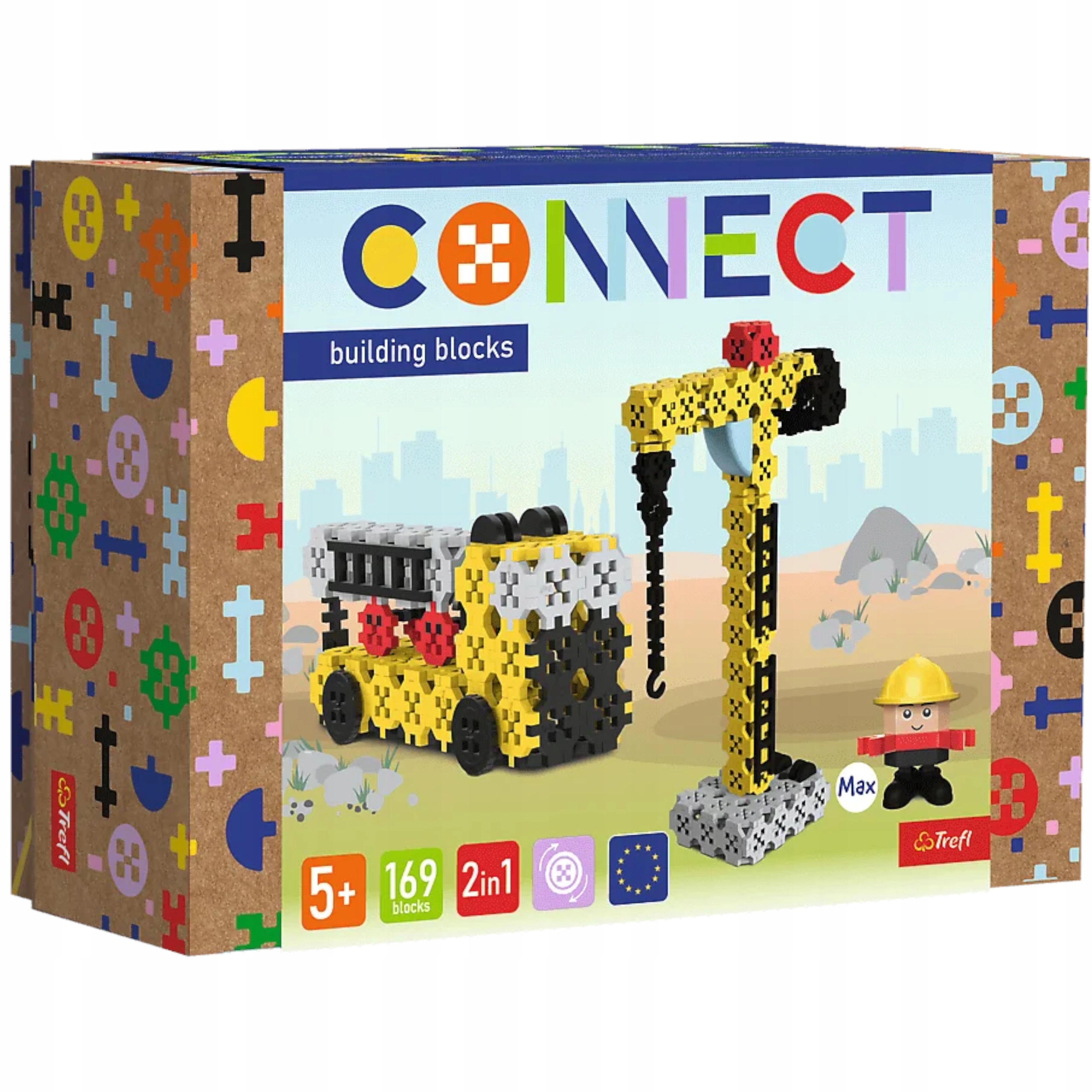 Zestaw klocków Connect 2w1 zawiera aż 169 klocków, z których można ułożyć dwa pojazdy: żurawia lub dźwig albo można tworzyć własne konstrukcje. W zestawie są tez klocki dekoracyjne: okna, drzwi, maskę czy zderzaki, które uatrakcyjnią zbudowane samochodziki. Figurka kierowcy o imieniu Max, pozwala na tworzenie własnych historii, pobudzając wyobraźnię dziecka.