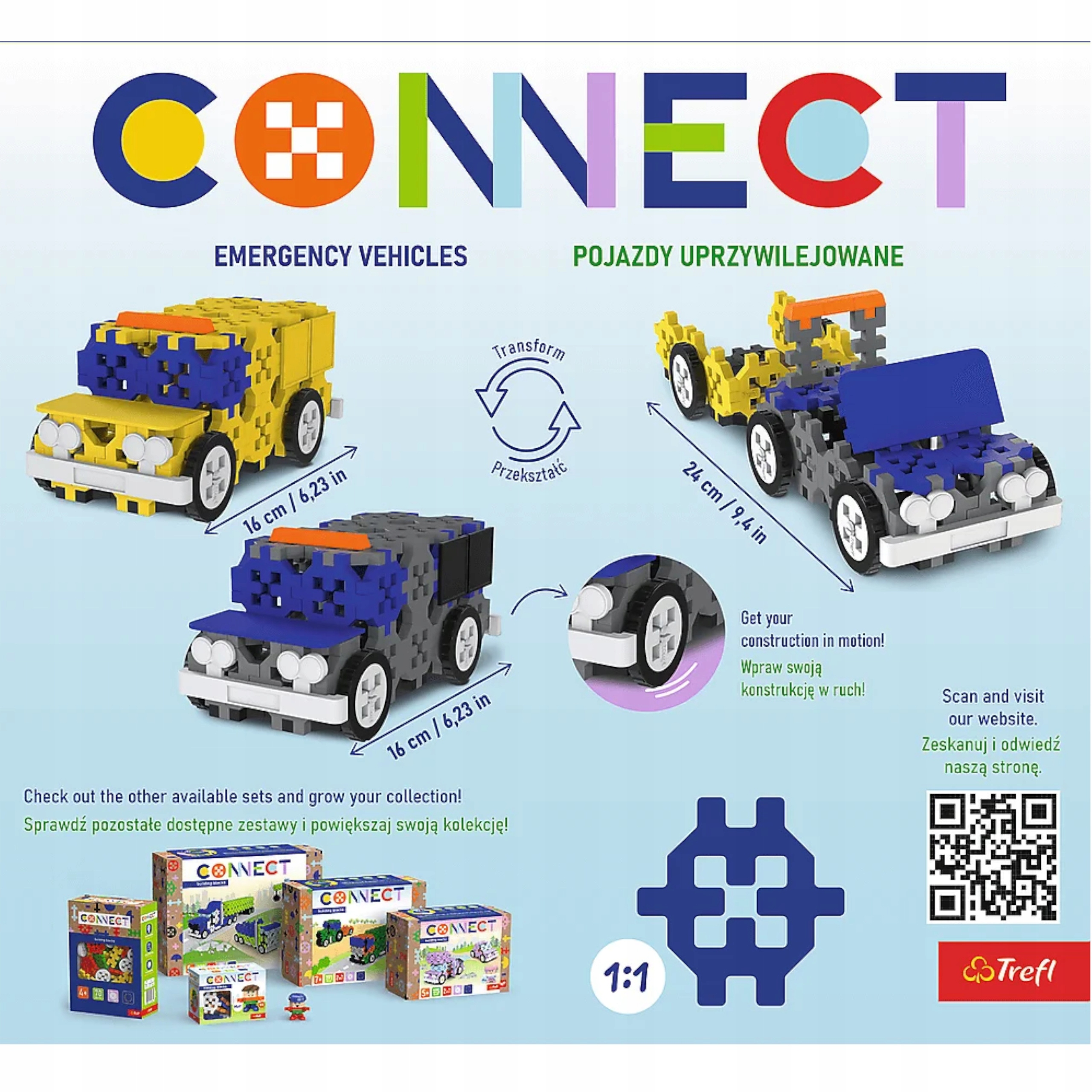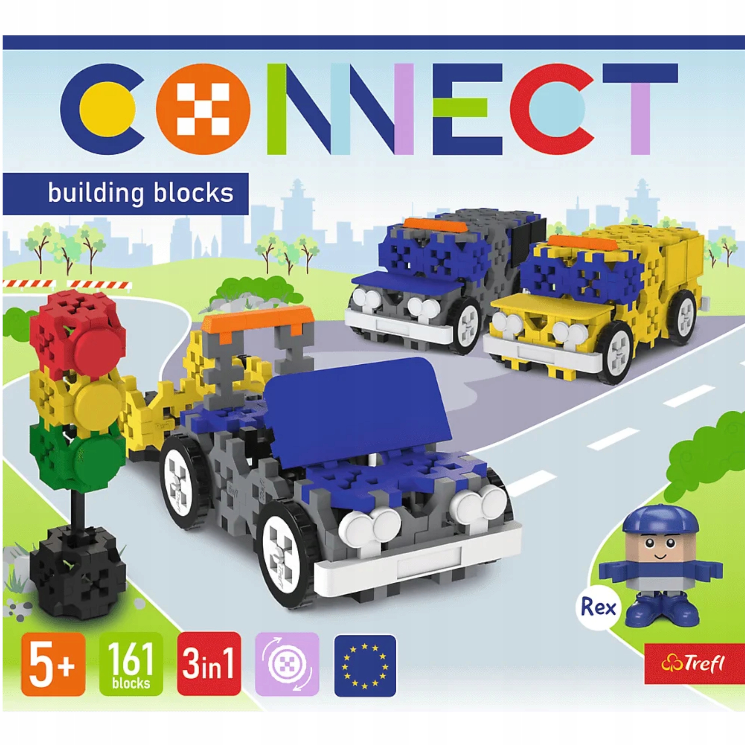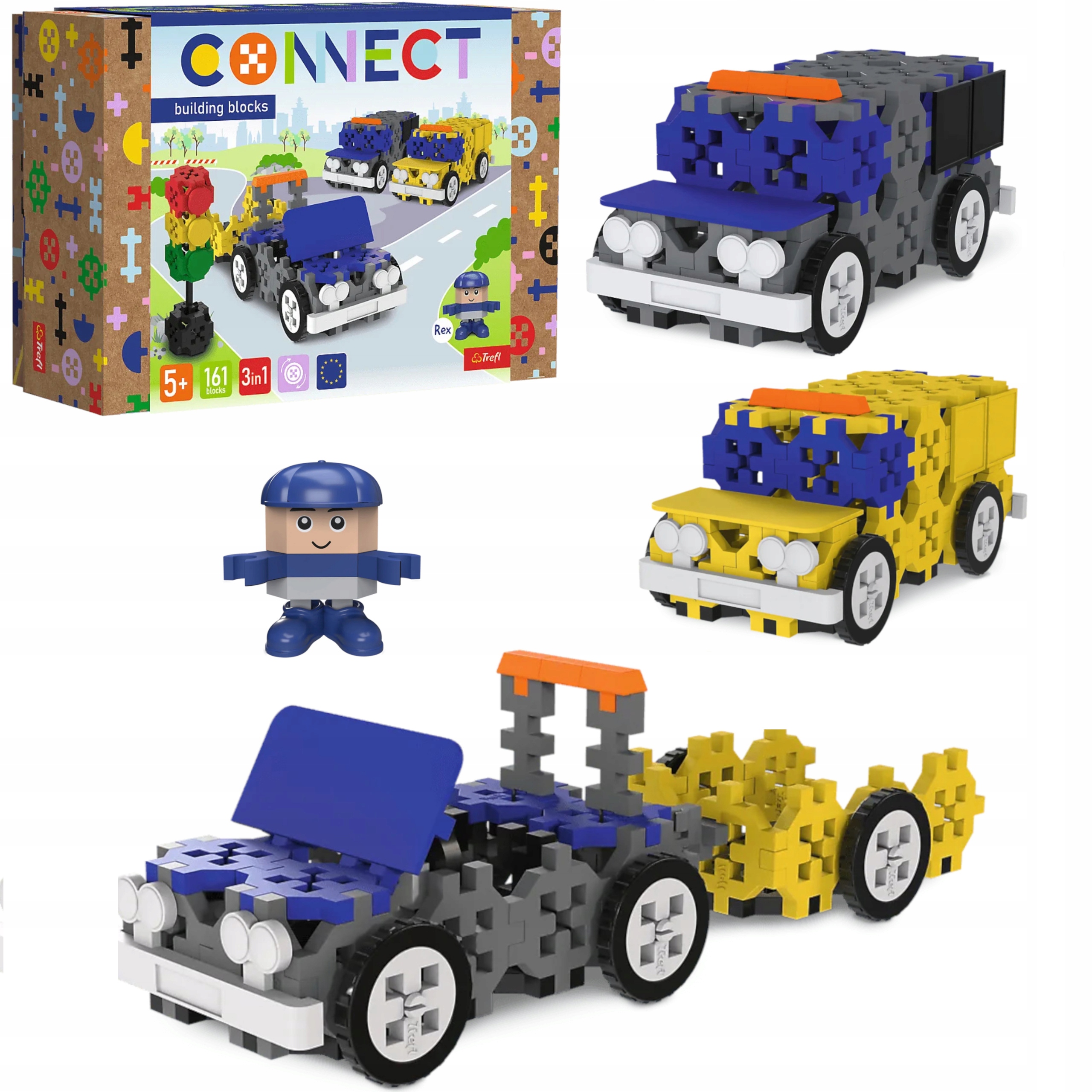 Zestaw klocków Connect 3w1 zawiera aż 161 klocków, z których można ułożyć trzy pojazdy uprzywilejowane albo można tworzyć własne konstrukcje. W zestawie są tez klocki dekoracyjne: okna, drzwi, maskę czy zderzaki, które uatrakcyjnią zbudowane samochodziki. Figurka kierowcy o imieniu Rex, pozwala na tworzenie własnych historii, pobudzając wyobraźnię dziecka.