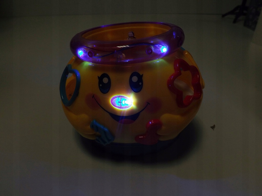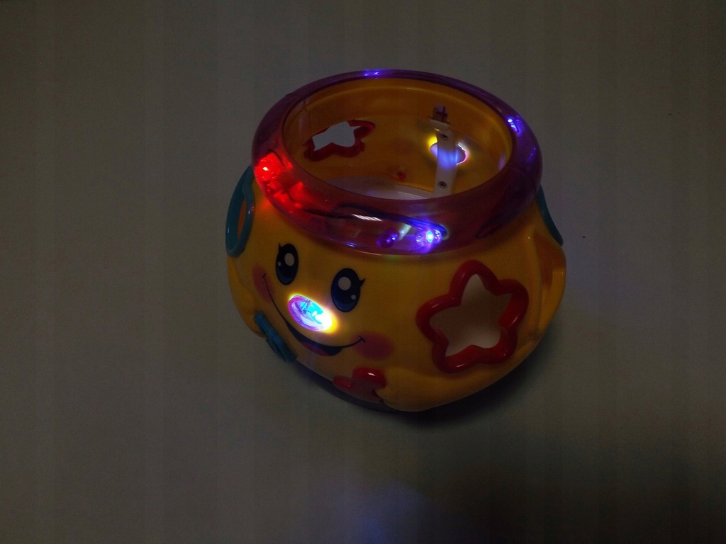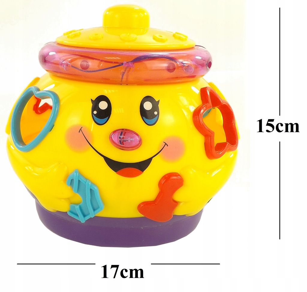 Po włączeniu gra wesołą muzyczkę, jeździ na kółkach i wesoła się kiwa, obręcz świeci, miga kolorowymi światełkami. Po umiejscowieniu klocków w sorterach, znajdują się one w brzuszku garnuszka. Pojemny brzuszek garnuszka zmieści klocki ale i także zapewne inne potrzebne skarby malucha.