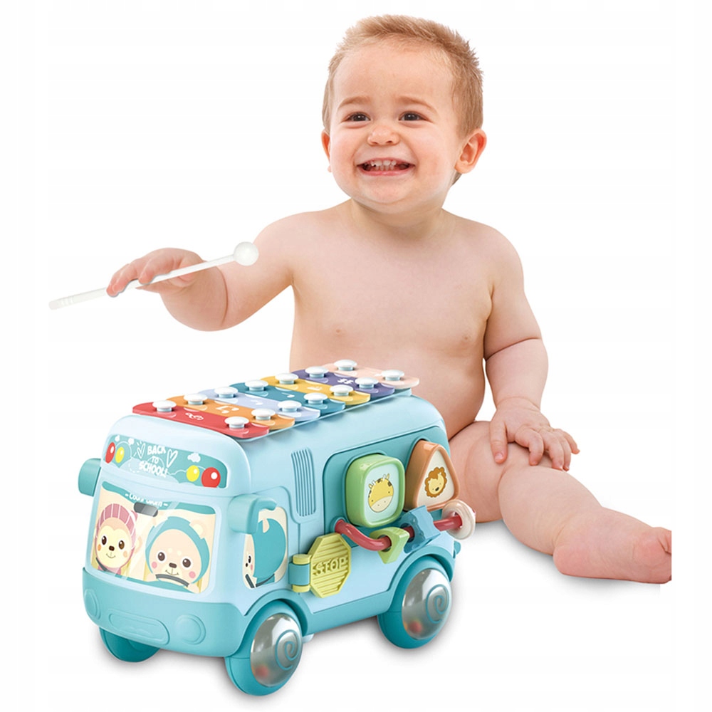 Interaktywny autobusik z sorterem, cymbałkami i grzechotkami to świetna edukacyjna zabawka dla Twojego Malucha, która rozwija jego zdolności manualne.