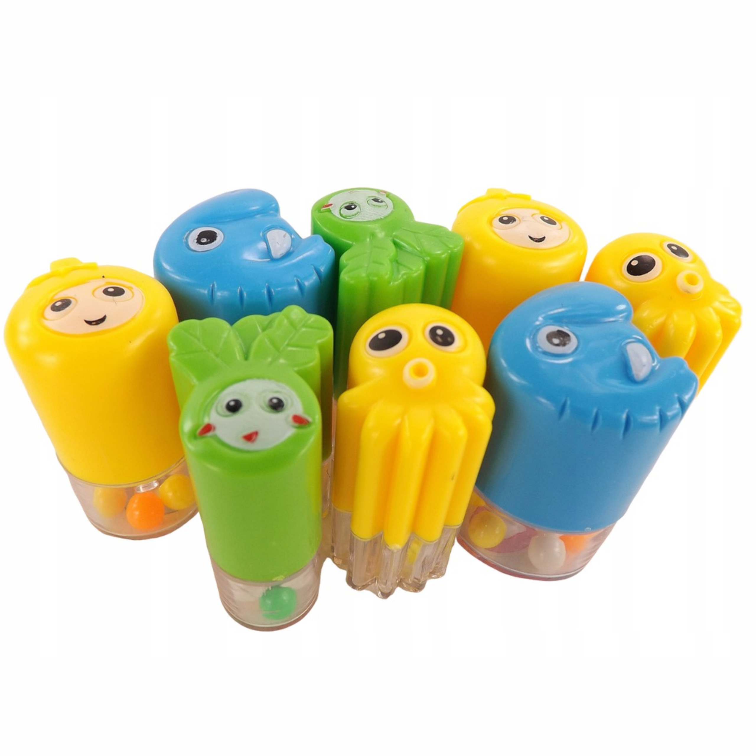 - 8 grzechotek z kuleczkami w 4 różnych kształtach: ośmiorniczka, pomidorek, kalarepka, słonik.
