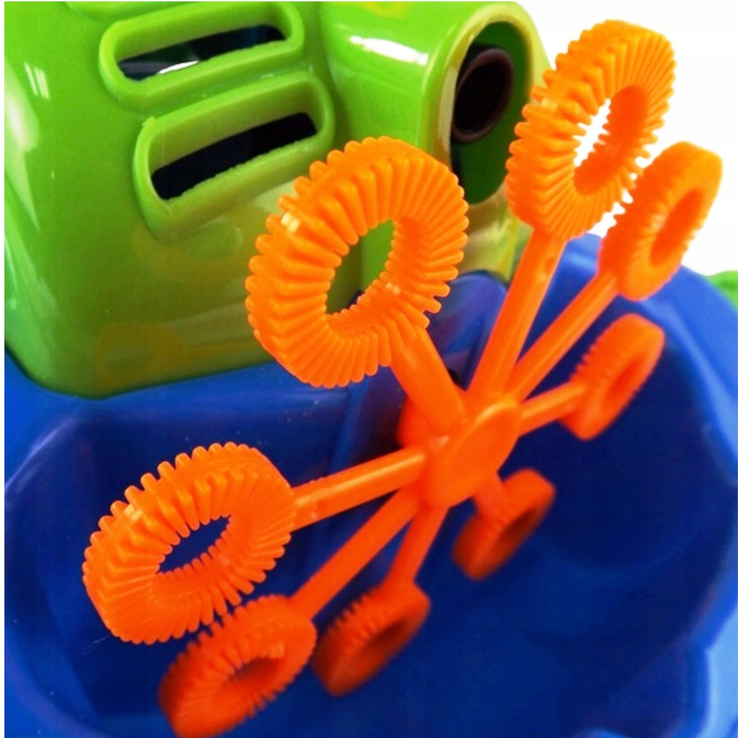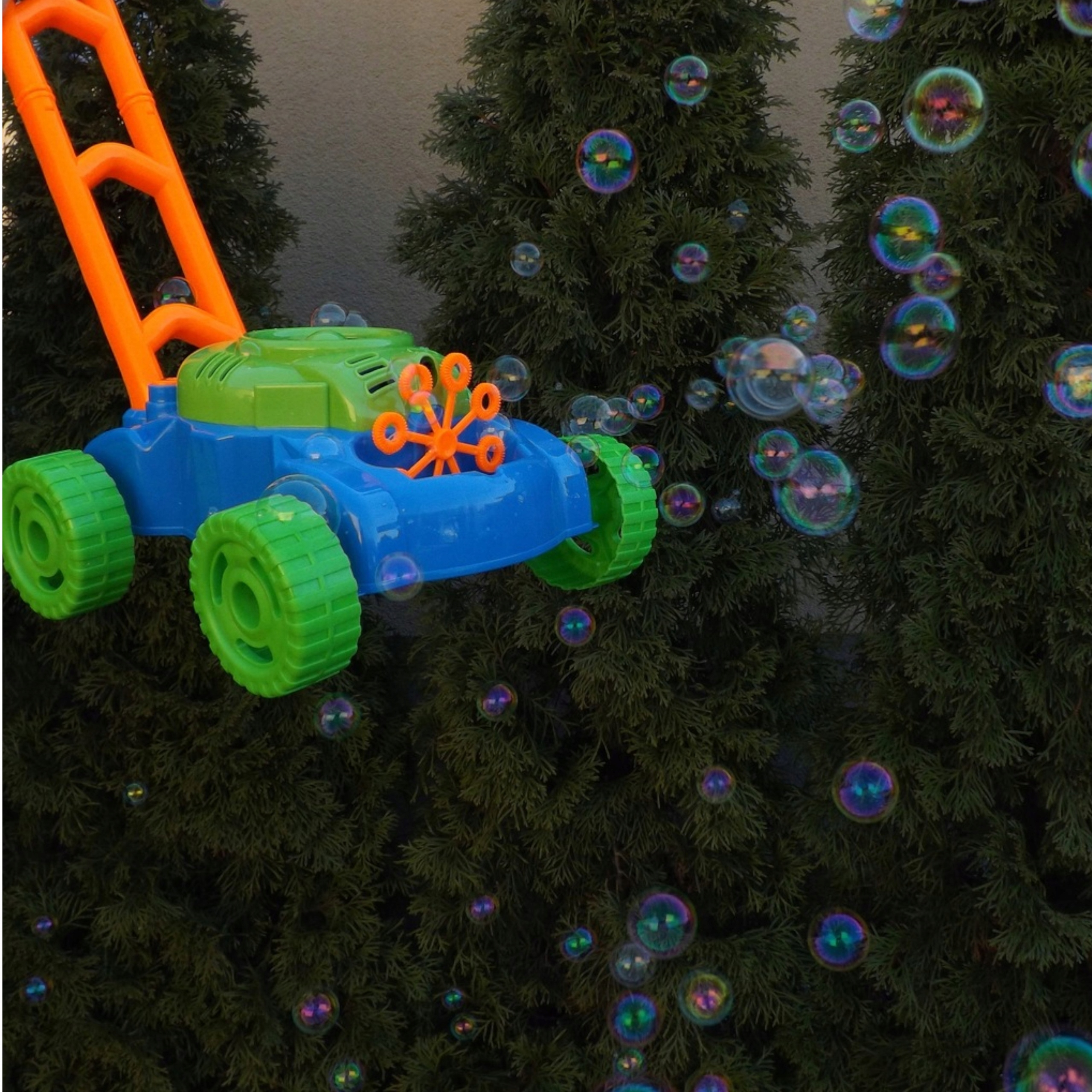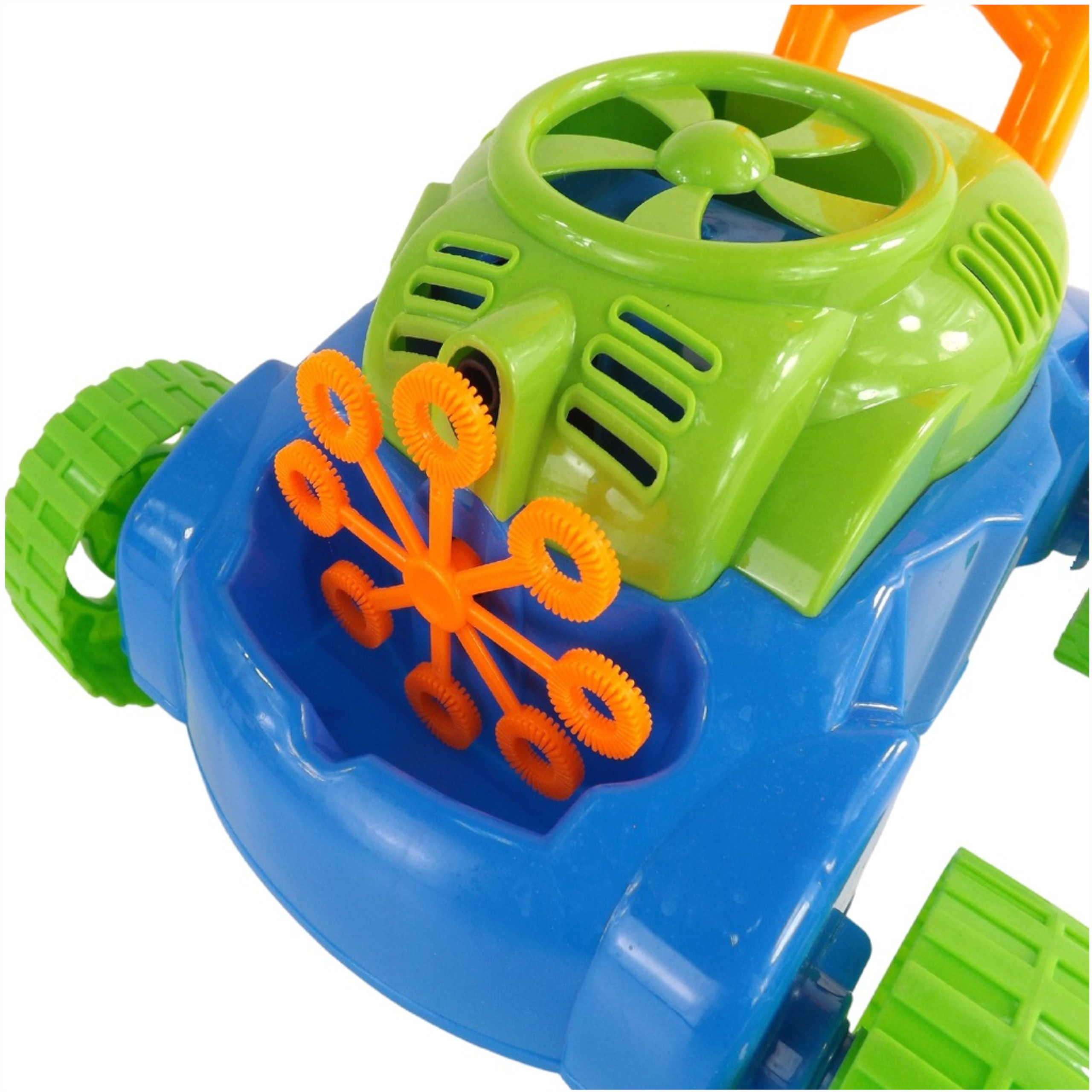 Bańki puszczane są automatycznie. Mały wiatraczek znajdujący się w górnej części obudowy silnika kosiarki, wytwarza strumień powietrza, który kierowany jest na 8 kręcących się pierścieni. Zanurzają się one w pojemniku na płyn do wytwarzania baniek i po kolei podsuwają pod małą dyszę. W ten sposób bańki puszczane są nieustannie. Dzięki 8 pierścieniom, zabawka wytwarza równocześnie dużą liczbę baniek.