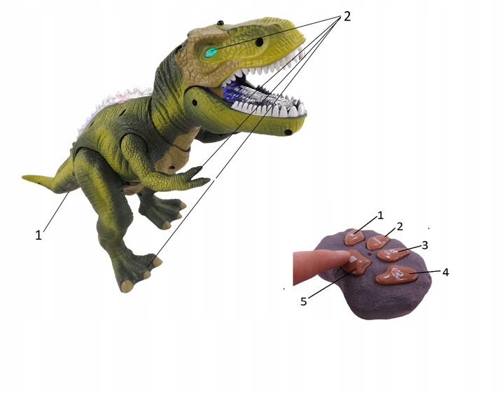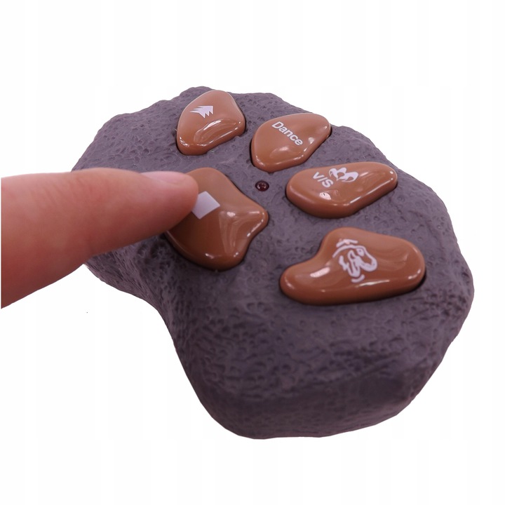 1. Dinozaur jest sterowany za pomocą dołączonego pilota w kształcie skały. Po włączeniu pierwszego przycisku dinozaur szybko porusza się do przodu, świeci, rusza rękami, głową, otwiera paszcze, a na końcu zatrzymuje się i ryczy.