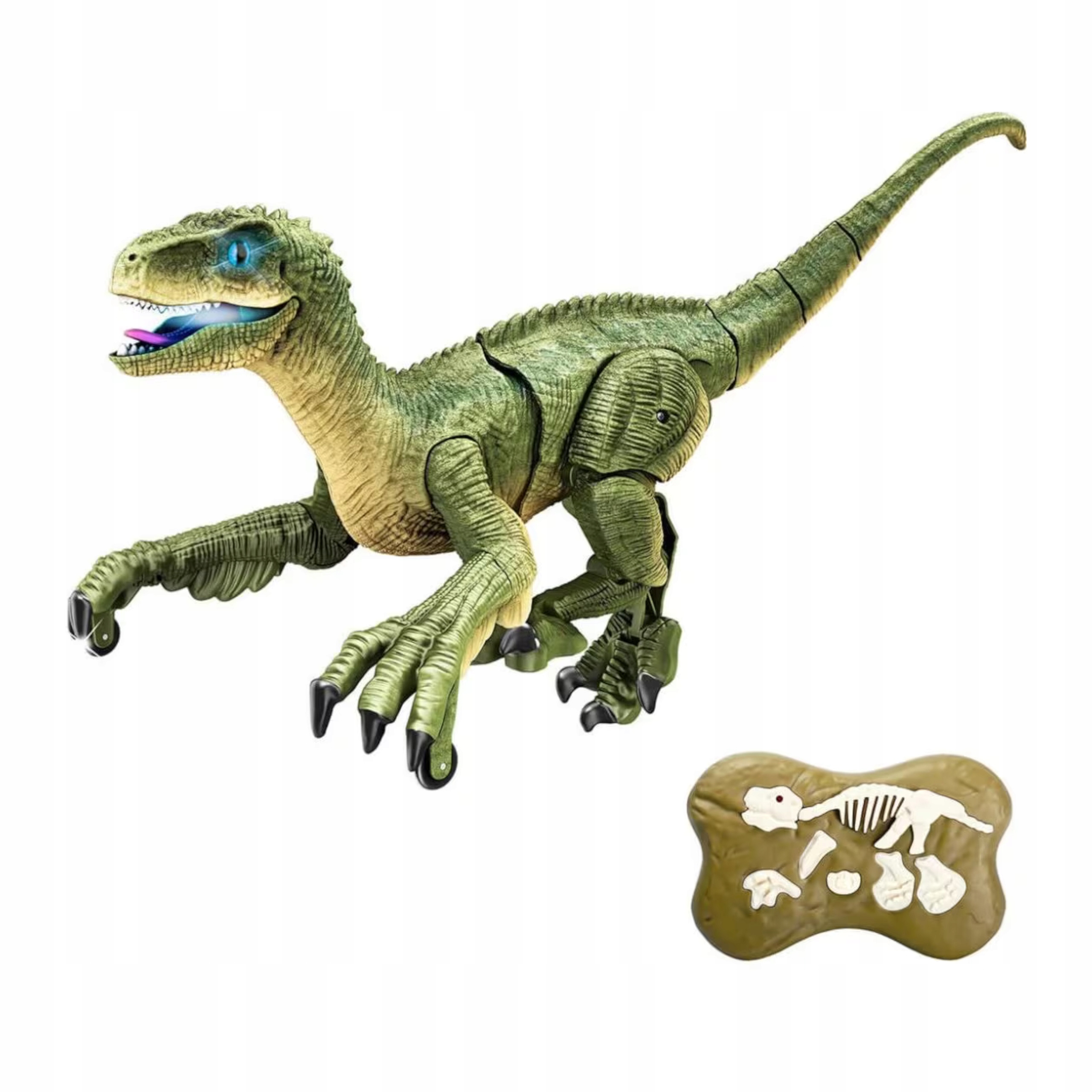 W zestawie znajduje się pilot do sterowania dinozaurem w kształcie skamieliny na którym znajduje się szkielet dinozaura, każdy przycisk odpowiada innej funkcji.